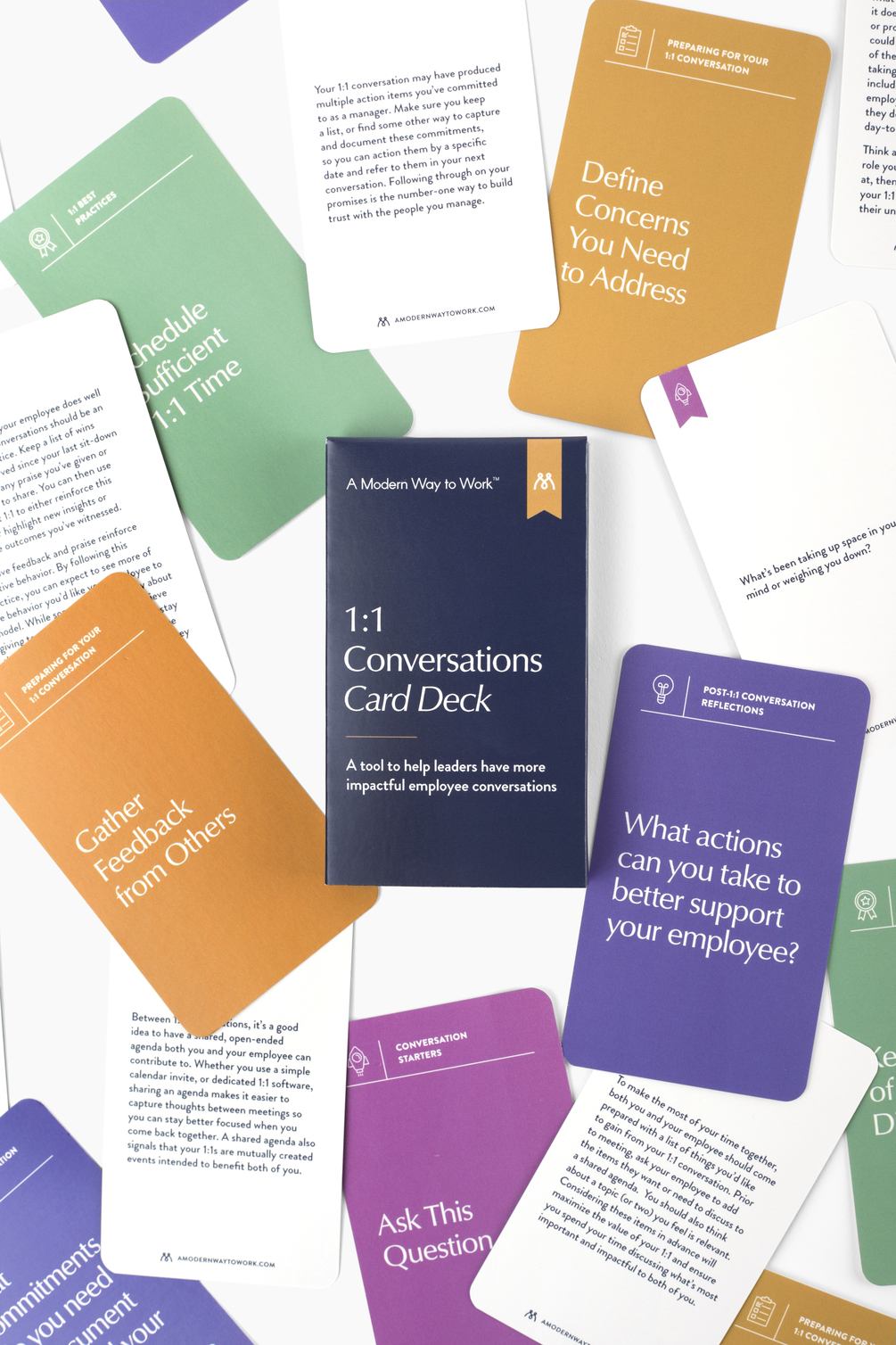 - 40 cards with quick, easy-to-implement tips for conducting more effective 1:1 employee conversations.